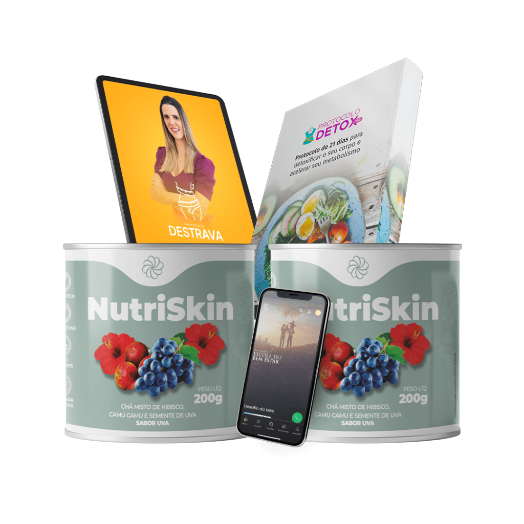 A fórmula exclusiva do NutriSkin vai melhorar a sua circulação e com isso reduzir o inchaço e oxigenar melhor as suas células. Os nutrientes presentes estimulam a recuperação de colágeno natural da pele, combatem a inflamação das células e, consequentemente, vão acabar com a celulite e deixar sua pele lisinha.